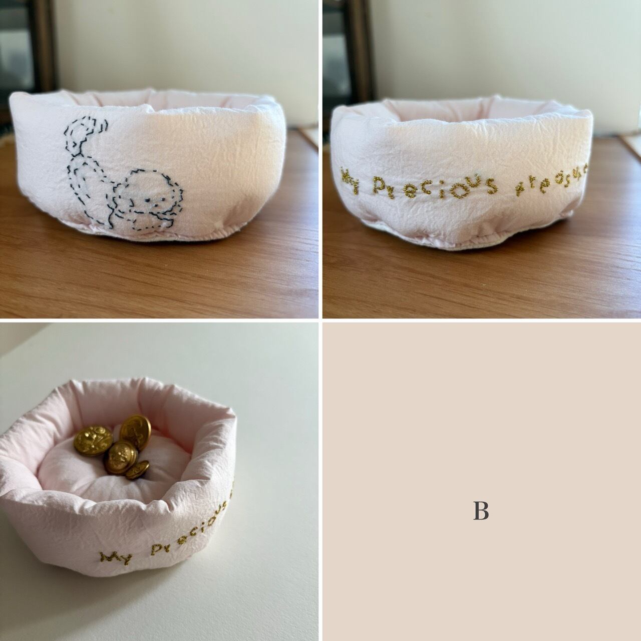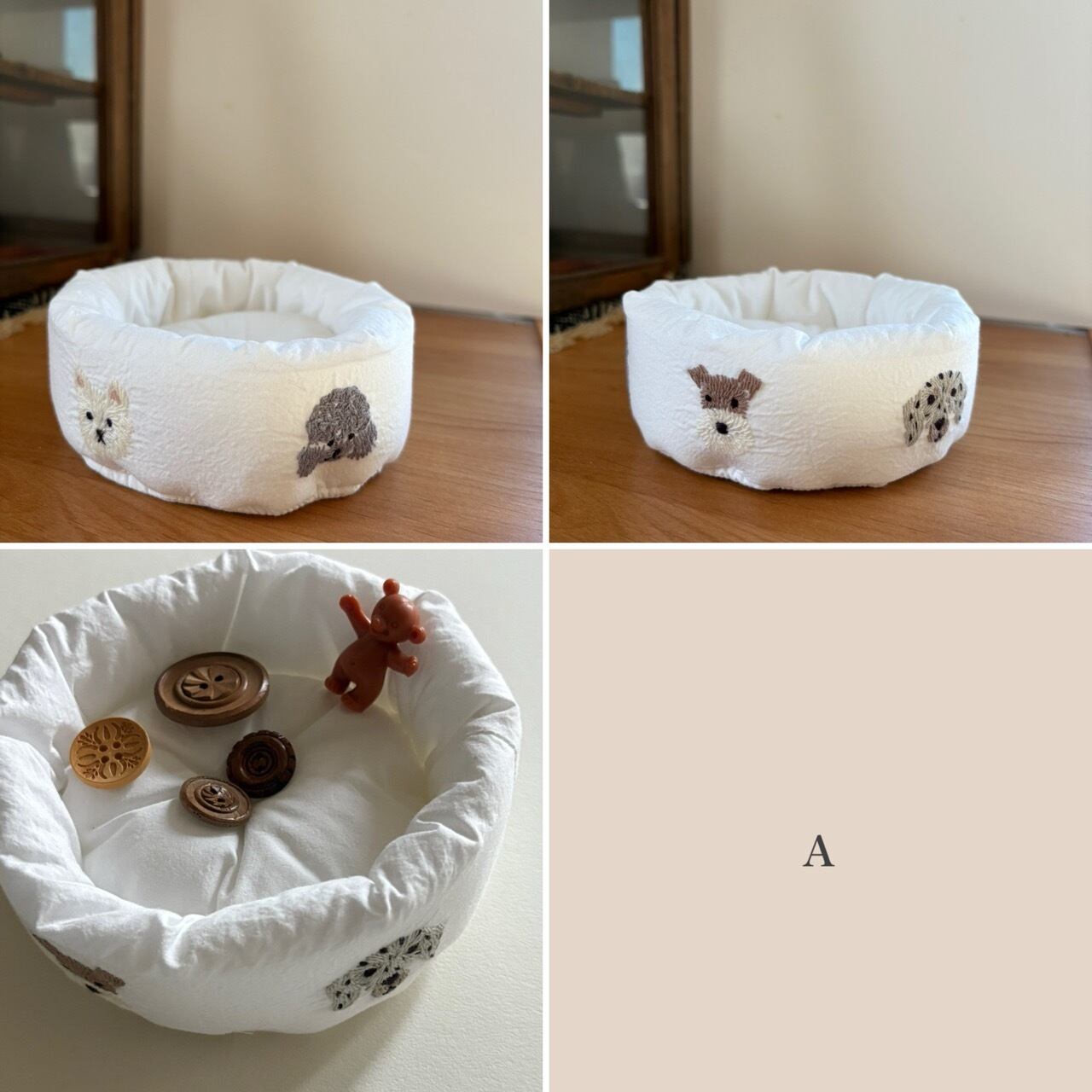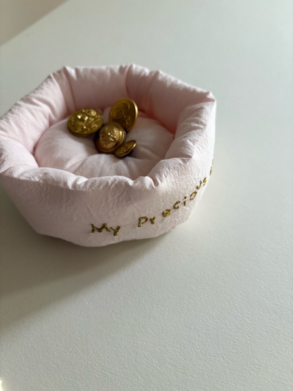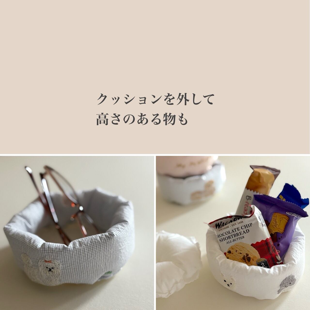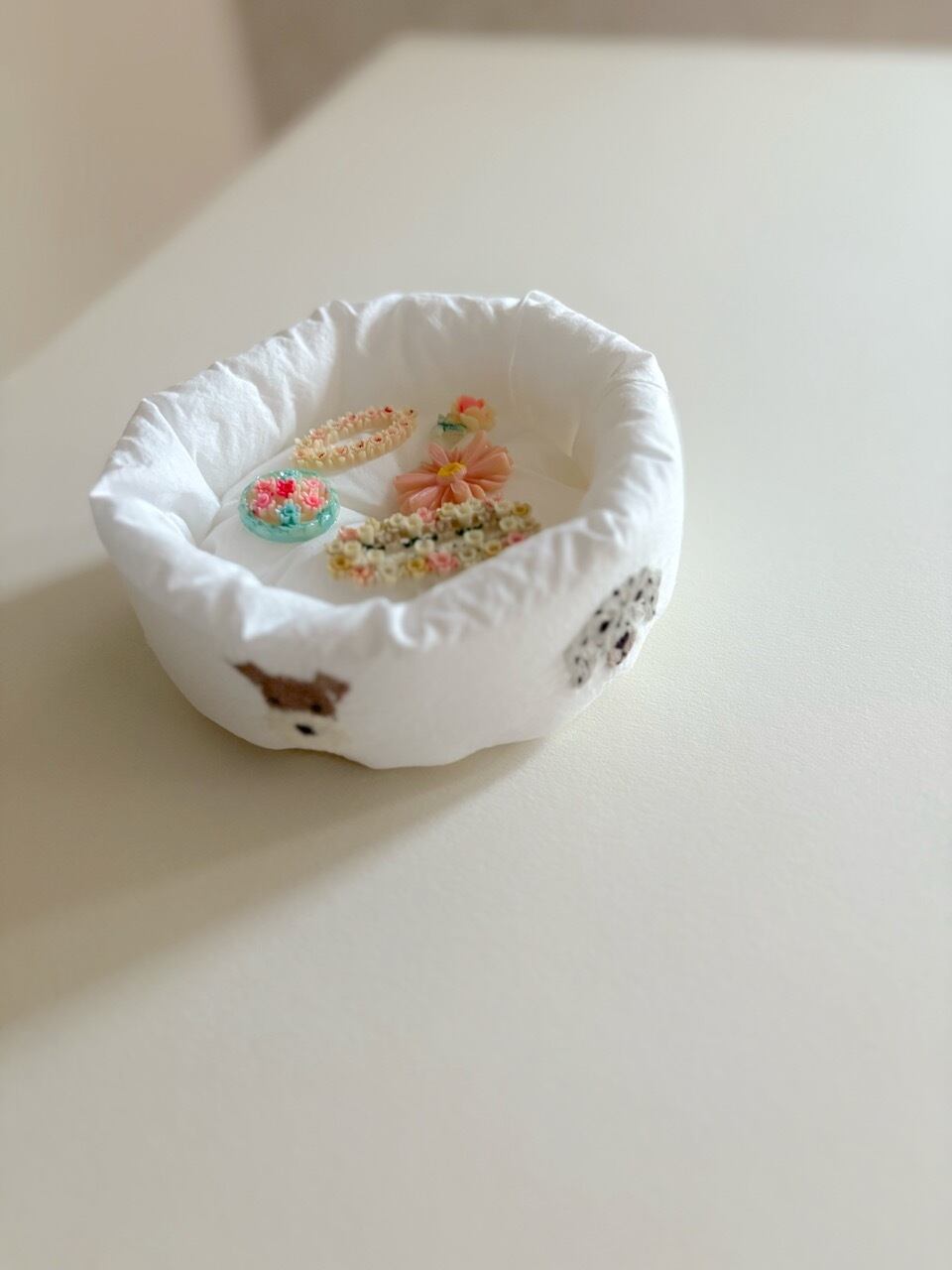形崩れ防止に底部分はキルトで縁縫いをしていますが丸の形がいびつだったり縁にシワが寄ってしまったりと細かく見出すと色々手作業感を感じてしまうかもしれません。