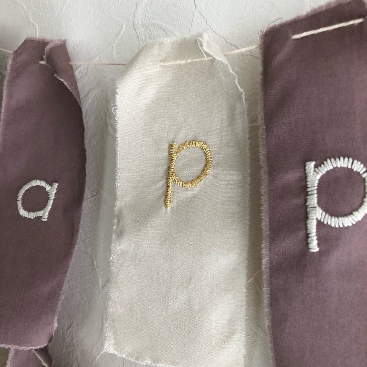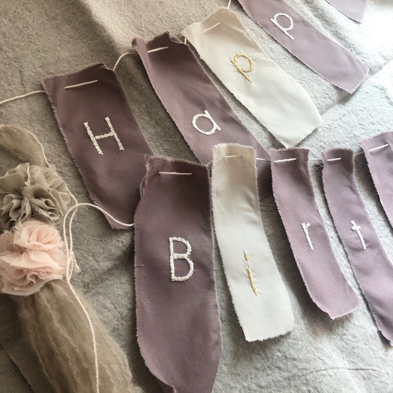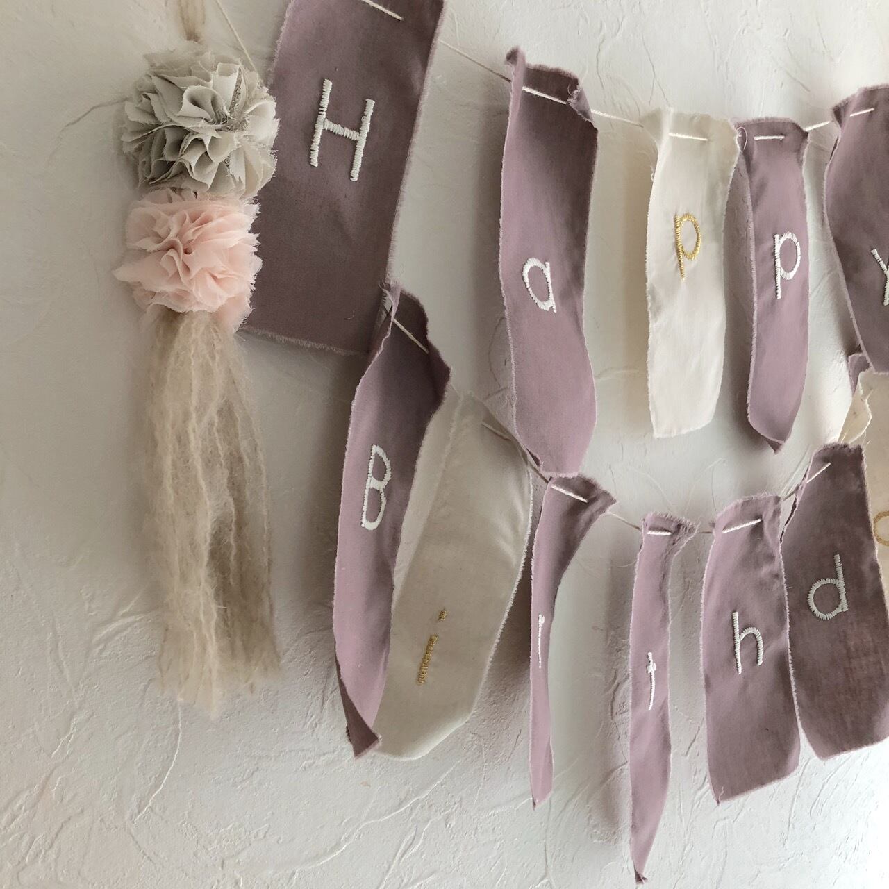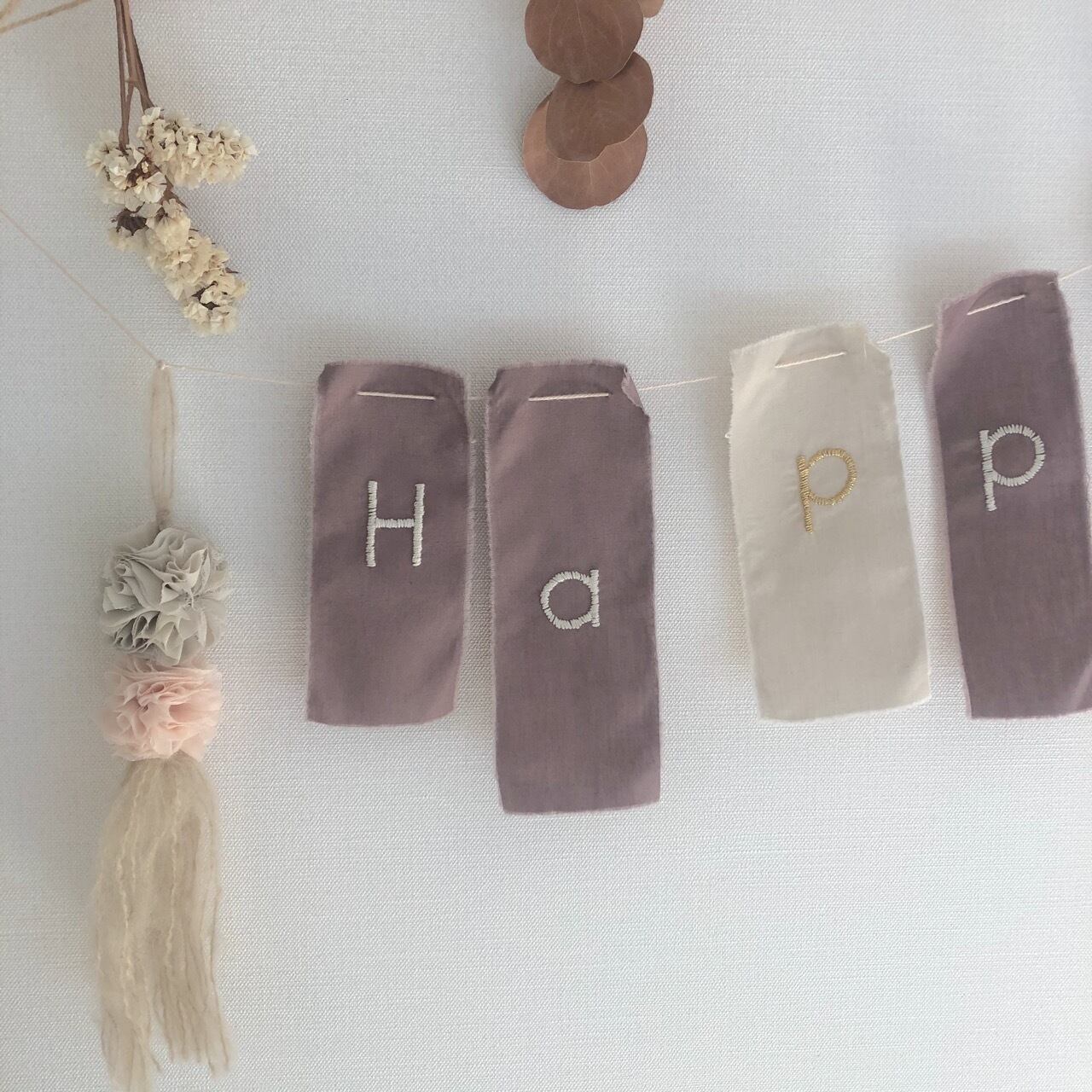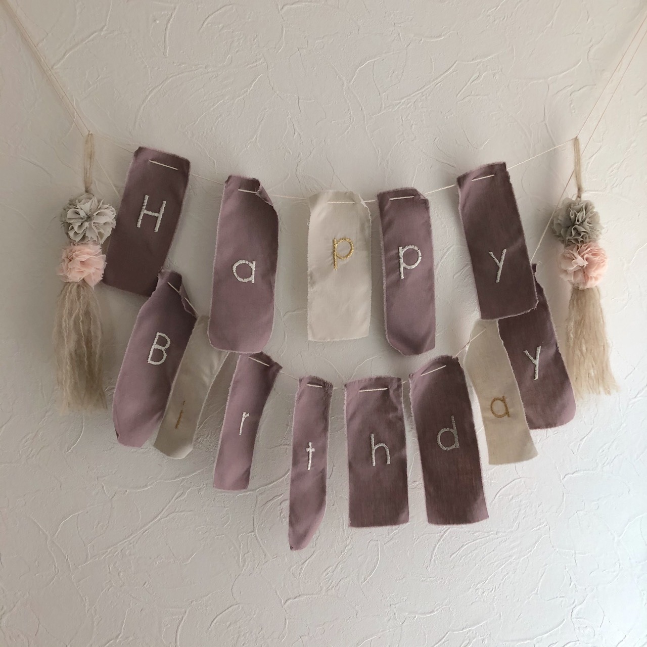 四方切りっ放しのデザインでナチュラルな雰囲気の「Happy Birthday」ガーランドです。