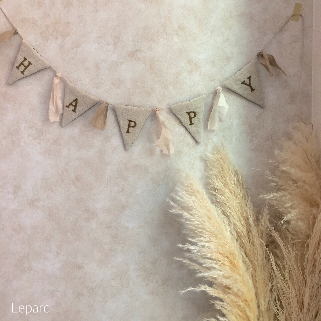お祝いや記念日、様々なシーンでお使い頂けるリネンの【Happy 刺繍ガーランド】です。