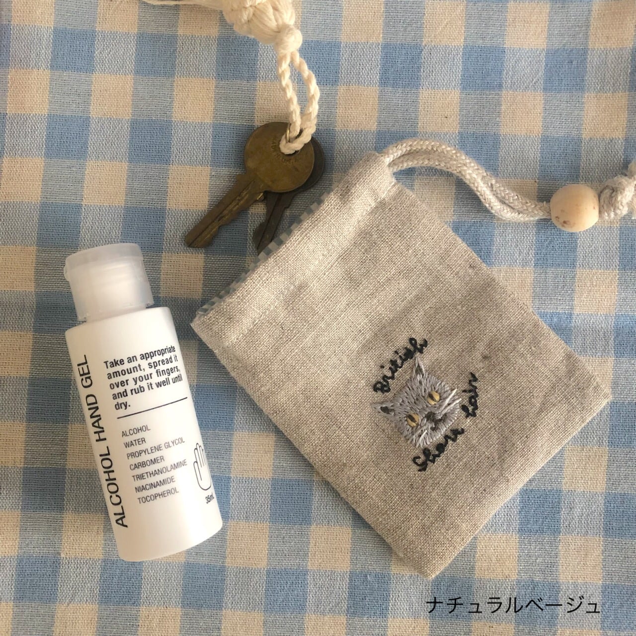 紐は片側のみ、長めにしておりますのでカバンの持ち手などに引っ掛けることが可能です。