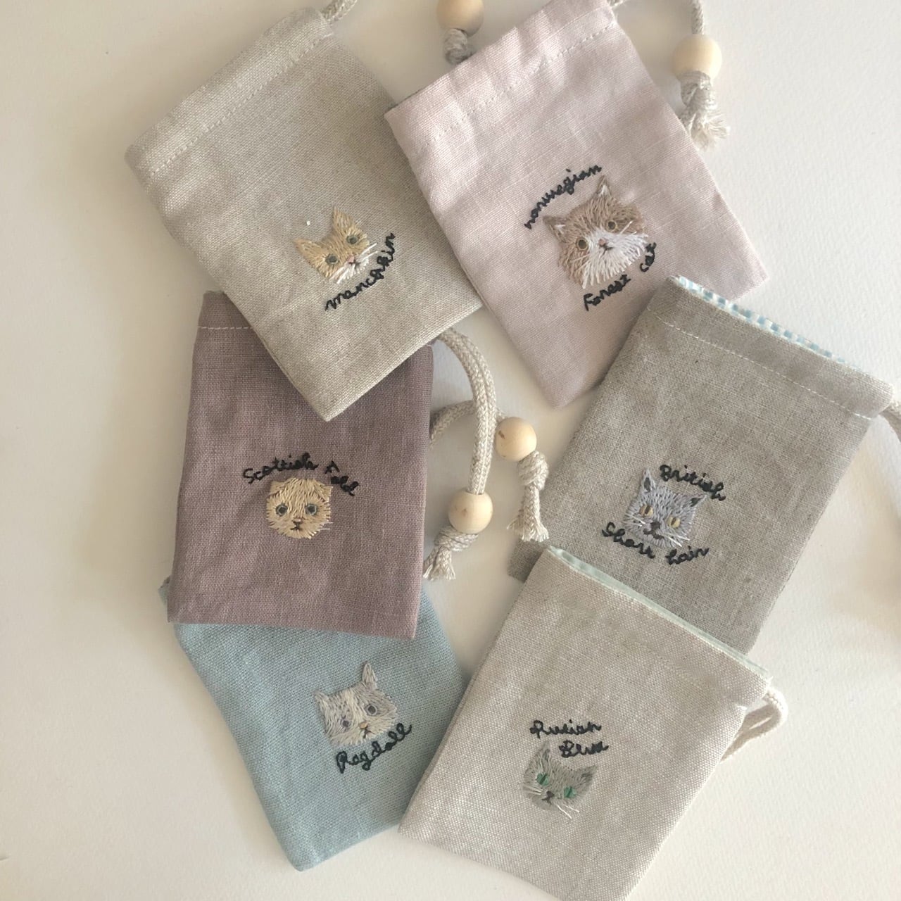 他作品「大人のリネン刺繍ミニ巾着」と同じサイズの刺繍入り巾着です。