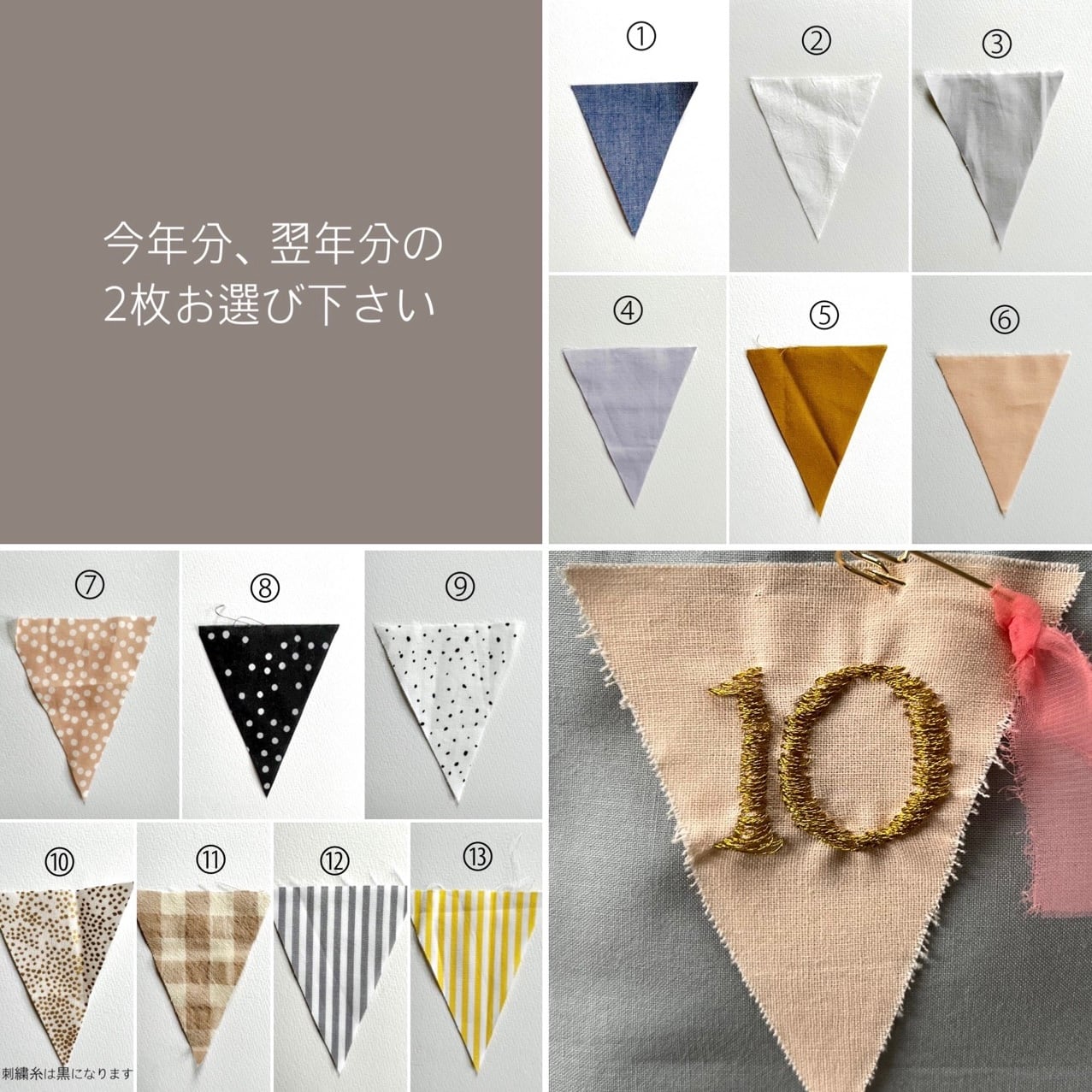 タペストリー生地と年齢タグ、お名前の糸色の組み合わせをご想像しやすいようまとめてみました。